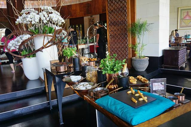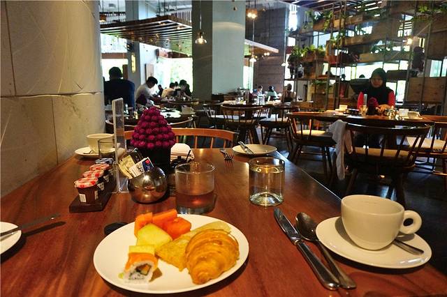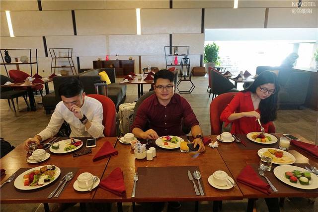 广州队伍集结完毕,现在才早上的7点钟,我们的导游带我们去吃早餐,就在机场里面的NOVOTEL酒店,这个安排非常的贴心和周到,大家一出关就可以马上吃早餐了,我们放下行李,开始这个丰盛的自助早餐,空间宽敞,食物琳琅满目,水果、沙拉、甜点、糕点、面包、蛋糕、寿司好多好丰富,在印尼的第一场美食,可惜胃容量有限,只能品尝几个,其他的都装进相机带回家。
