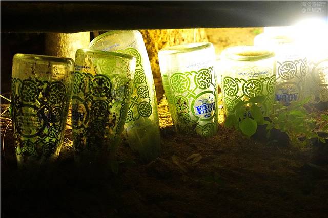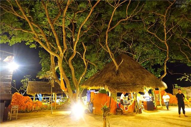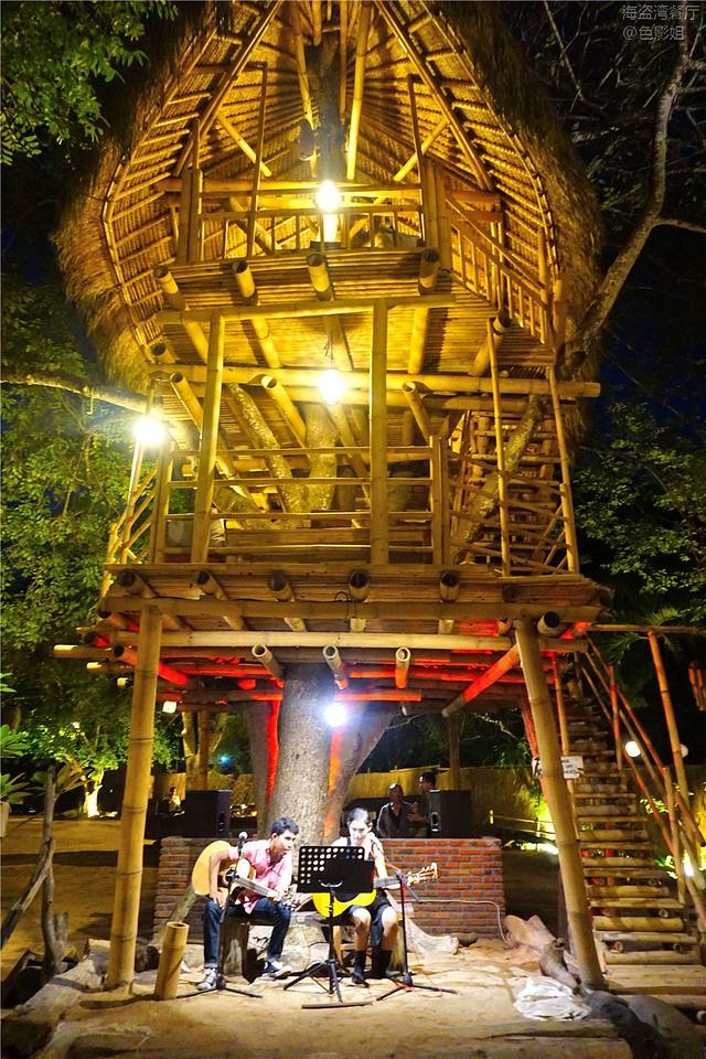 我们走进这里的时候,前面的就听到了音乐声,在一个原始的小阁楼下,坐着一对俊男靓女,两人各抱着一个吉他,面前架起的话筒,因为带有音效,整个小院里弥漫着美妙的音乐,夜幕之下,树影灼灼,草棚上的叶子温柔地垂下,在夜风中轻轻摇曳。