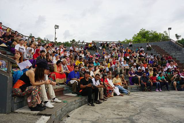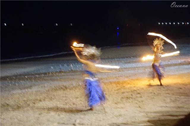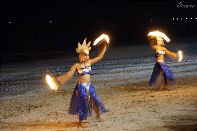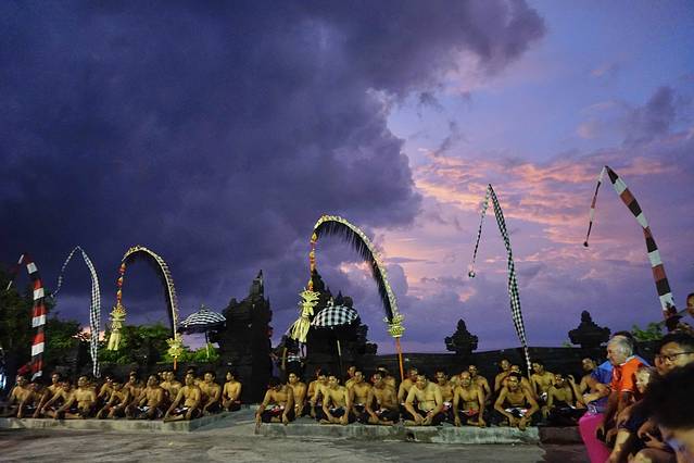 完全区别于我们以往见到常规的舞蹈,没有长长的歌词 ,百来位猛男不断重复齐声呐喊“chak-(恰壳)“,从开场到结束长达一个多小时,还有一些我们无法理喻的魔语,在恰壳/恰壳/恰壳的背景声中,故事中的人物粉墨登场,现场是一个阶梯环形的舞台,更像一个祭祀场,圆形的舞台中间是一个黑色的祭祀火炉,火炉上面5把火,在晚风的吹拂下这火光时明时暗,现场座无虚席几百上千个观众,这个神奇的祭祀之舞把我们带入了一种神秘诡异氛围。