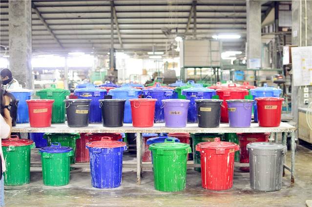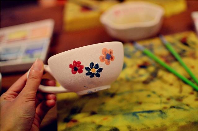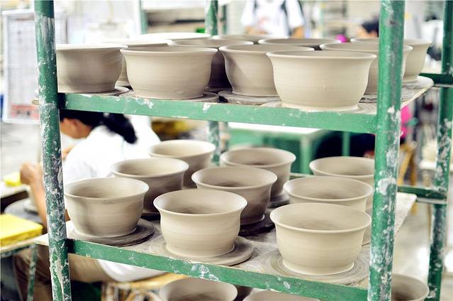不同颜色的桶,装着不同颜色的颜料,可以,我们现在可以看到五颜六色的陶器。