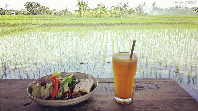 Nook Restaurant,我与Nook的邂逅,惊艳的第一霎那,不是它鲜花簇拥的门面、也不是它家的原木餐桌椅,也不是满屋的欧美客人,而是走到后花园,眼里是一片绿色的水稻田,刚擦的秧苗嫩绿色,凉风习习,花叶摇曳,此刻,心已醉。