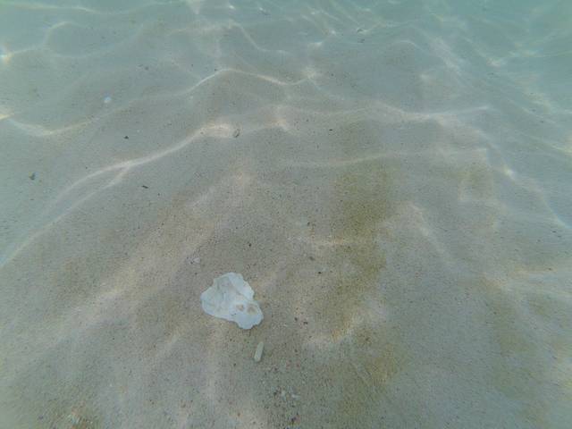 因为我们在这里停留的时间不够俩小时,所以急不可待的,我想潜到水下去看看,把面罩卡在头上,这个面罩把鼻子和眼睛都罩了起来,鼻子被顶住,口里塞入一个管子,这个管子通到水面,但是特别的短才只有三十厘米,把头埋到水下的时候,可以看到水下的沙滩,沙子里的贝壳,太阳照到水下的荡漾的波纹。