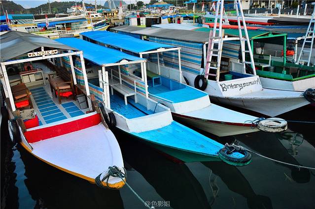 我们先去科莫多国家公园,需要四个小时的航程,港口停泊着好多颜色亮丽的船只,让我们来观赏一下码头风光吧!
