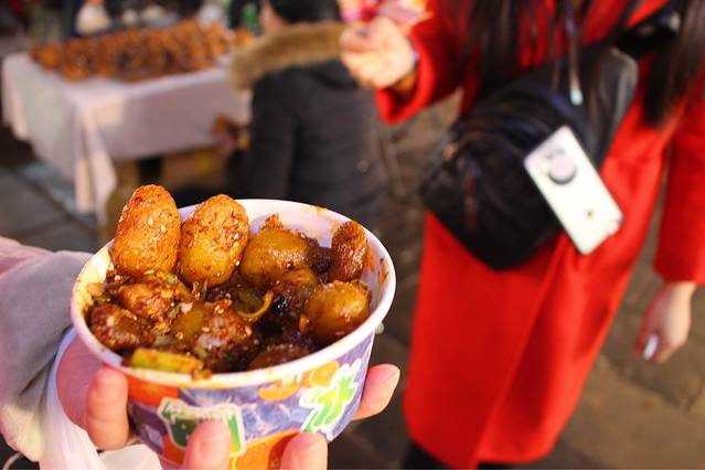 小土豆,这个在学校外面很多小摊有买,这边的口感不一样,土豆皮炸的不是那种脆脆的,反倒是很有嚼劲,里面很软。给四颗星。