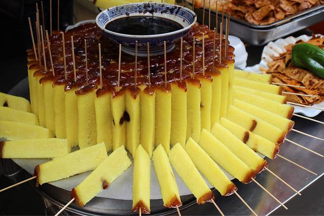 桂花糕,沾那个黑色的酱才有桂花味,糯米糯糯的,要趁热吃。小W就不能接受这个味。