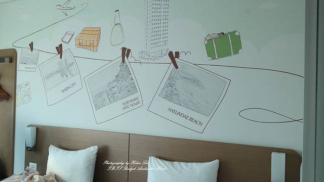 客房的面积不算太大,房间的壁画和酒店大堂的风格一致,干净利落,壁画的内容都是海云台的景点,包括海云台海水浴场,冬柏岛和MARIN CITY,全部近在咫尺。