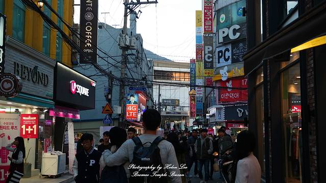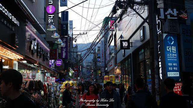 釜山大学购物街,由于主要的消费群体都是学生,因此这里的东西以年轻人使用的为主,有很多有特色的饮食店和化妆品店。