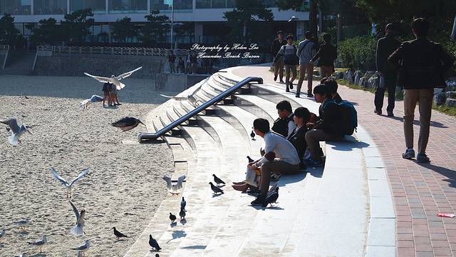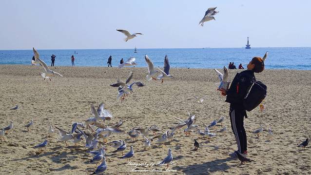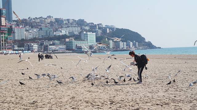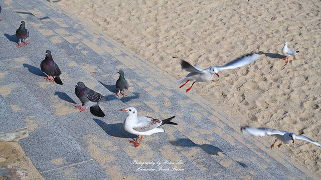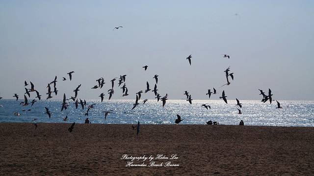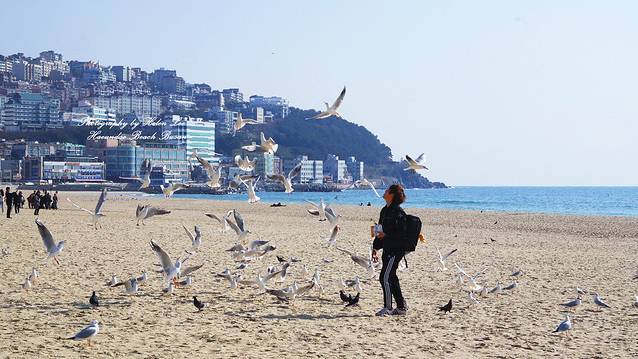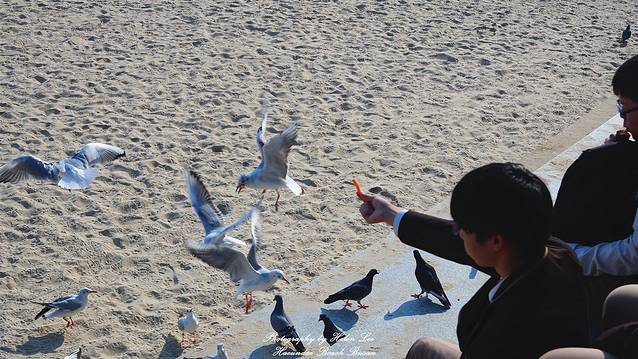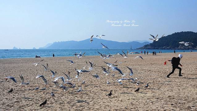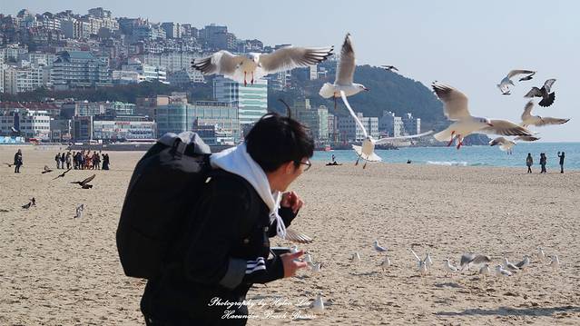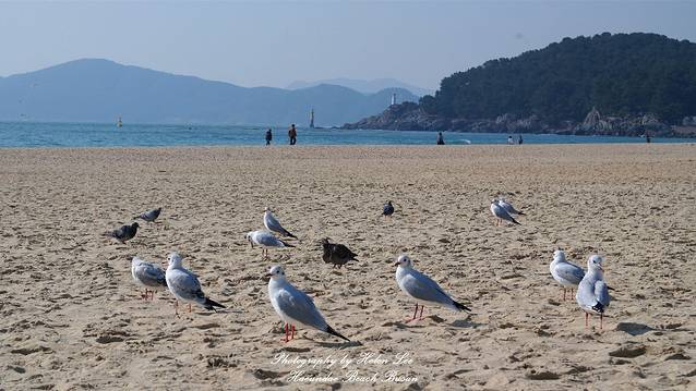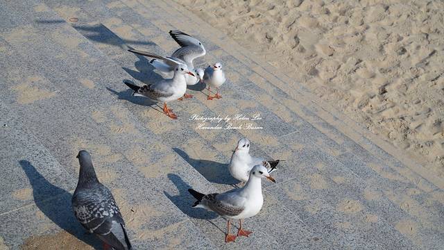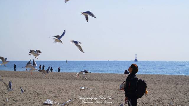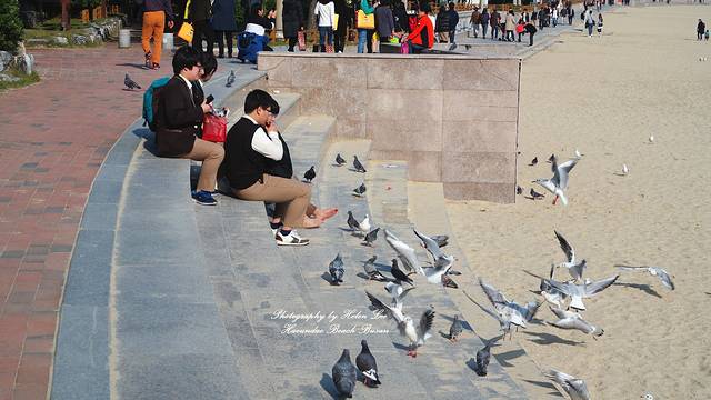 在咖啡店休息完毕后,趁着阳光充足,我们走到海云台海水浴场。可能是因为时节的原因,这个时候的沙滩上有很多海鸥,也许都是从外地来这里过冬的。