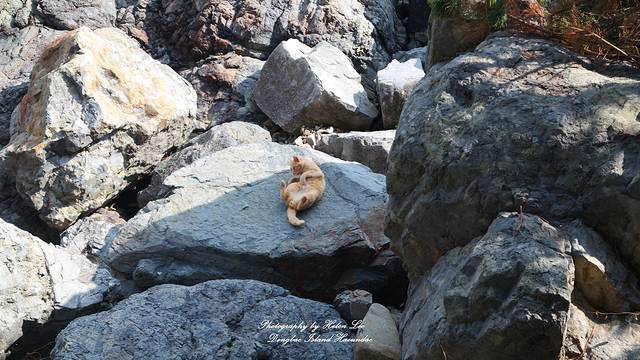 一只野猫躺在礁石上晒太阳。