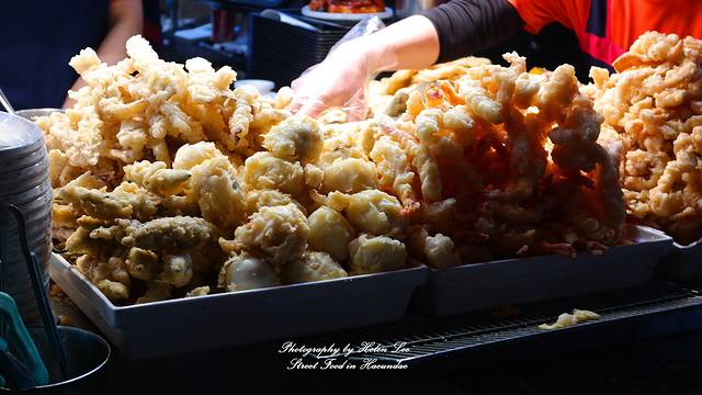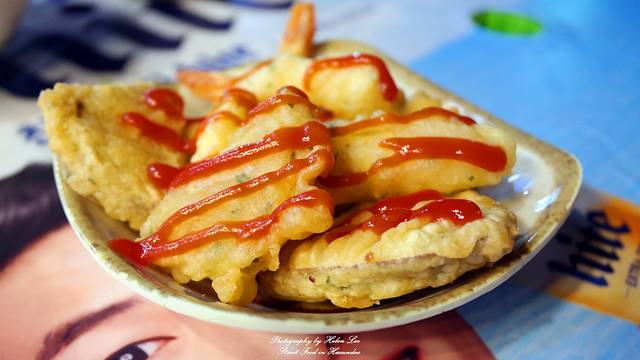 小伙伴一直念叨着想吃的炸物小吃,选好后店家会再度放进油锅炸,炸好后切好,并撒上番茄酱。收钱的是一个中国留学生,男生可能是刚接触这种工作不久,虽然不太熟练,但是也很细心。在国外学习的留学生都不容易,这几年中国游客到釜山的数量多了很多,他们的语言优势也是他们的就业筹码之一。