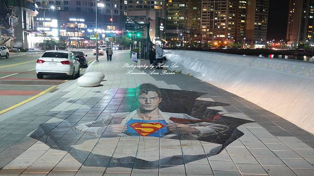 MARIN CITY建筑群下方是一条沿海步道,这里的元素和电影息息相关。步道入口的地板上,画着一幅超人的3D画。