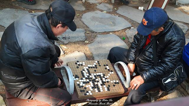 捣蛋的熊孩子调戏海鸥,而老爷爷们在静静地下象棋。