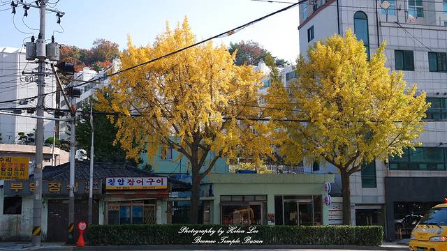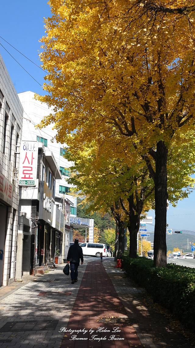 从梵鱼寺出站,马路两旁的银杏树叶已经变成了金黄色。