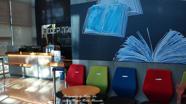 色彩缤纷的酒店前台,以及墙壁上粉笔式的壁画,不同于平常的酒店装修风格,给人一种干净的第一印象。酒店的大堂提供电脑和打印机服务,餐厅就在电梯口的旁边,但不免费,早餐16500韩币一人。
