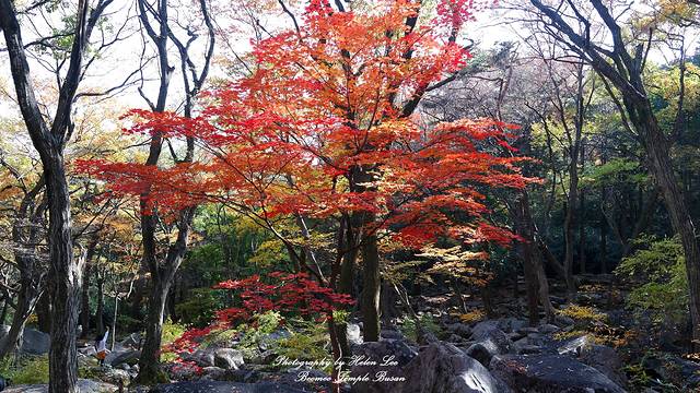 釜山的早晨,阳光特别给力,今天的主要行程就是去梵鱼寺赏枫。秋天的梵鱼寺是赏枫的最佳景点之一,釜山人也会在周末的时候和家人一起爬金井山。从海云台到梵鱼寺,可以从水原站换乘3号线至燕山站再换乘1号线至梵鱼寺站下车,下车后换乘90路公交车到梵鱼寺入口。
