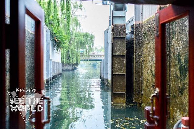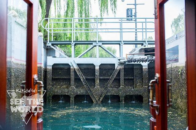 最有意思的应该是游船过闸门的时候,护城河人工修建了水闸,有水位落差,所以游船在过水闸的时候需要等待五分钟,从上水位红线的位置,等待水闸放水到黄线的位置,然后才会打开闸门,继续通行。这种体验,对于第一次经历水闸放水的游客来说,非常好玩。