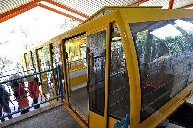 我们到茶溪谷,一共乘坐了三段车。先坐全透明玻璃轿厢的缆车,沿着很陡的山坡,从大侠谷站,到了云中部落站。缆车像一列小火车,一个个轿厢相连,每个轿厢可以坐十几个人。