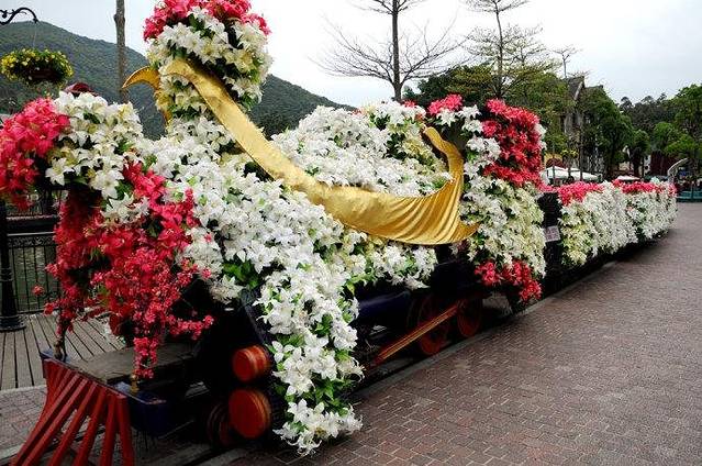 小镇宽阔的街道两旁,是一幢幢欧式的小洋房,铁轨铺设在路中间,一辆用鲜花铺设的老式火车停在湖边,引得很多人合照。