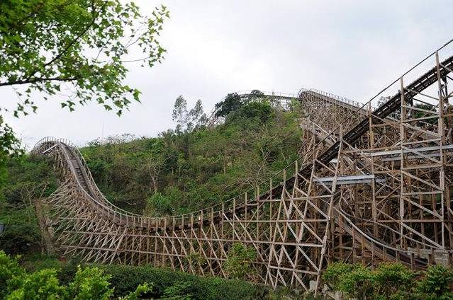 我们本来去看咆哮山洪,是个特技场景演出,可惜赶到时已经结束了。然后去排队坐了木质过山车。过山车坡度不大,惊险程度不是顶尖的,但长度很长。身上所有的东西都要取下来,包括发夹,可以放在寄存柜里。幸好只飞一圈,如果还有第二圈,我不确定我的脖子和脊柱会不会折断,很好玩但颈椎不好的人还是不要坐了,太颠。