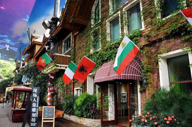 高大的绿树,红瓦黄墙,尖尖的三角屋顶,街道两边插满了各国国旗,和一家家精致浪漫的特色商店、餐厅、咖啡吧,很适合拍写真,遇上爱拍照的MM要美死了。还有一道LED天幕,在白天也是开放的。天幕我在北京和苏州金鸡湖也见过,这里的也一样。