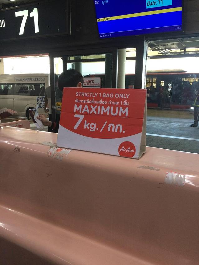 亚航行李:亚航的行李必须提前购买,否则机场购买费用很高。购买的为20Kg的行李。 手提行李的要求:每位乘客允许携带一件机舱行李和1个笔记本电脑包或者1个手提包。主手提行李大小不得超过56厘米 x 36厘米 x 23厘米,重量不得大于7公斤。