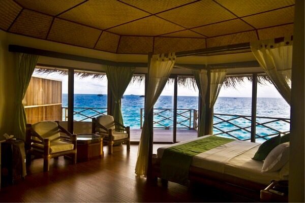 第一天的水感觉比较深,已经漫过了水屋的四层以下的全部台阶,杰哥下水体验了一下,水流比较急,没有游多远就回来了,我压根就没有敢下水,十一小时大飞机,加上中转水飞,路遇状态,已经相当疲惫了,躺在水屋舒服的大床上,睁眼已经是晚餐时间!