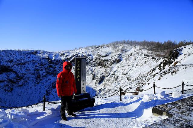 不到一个小时就爬到了火山口,山风凛冽,吹的人在风中凌乱,不一会儿就被自己呼吸的热气霜白了两鬓。