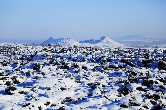看,这就是五大连池会呼吸的火山——黑龙山,由于地貌典型,状如黑龙,冬天的皑皑白雪都掩不住它黑色的光泽,所以称为黑龙山,又名老黑山。史料记载黑龙山喷发于1719至1721年间,是我国少有的近期喷发的休眠火山,也是我国最年轻的火山,更是造就五大连池的“功臣”。
