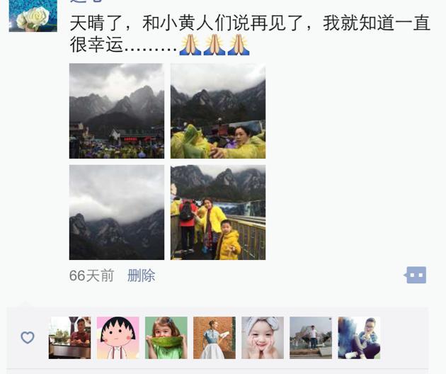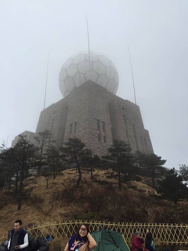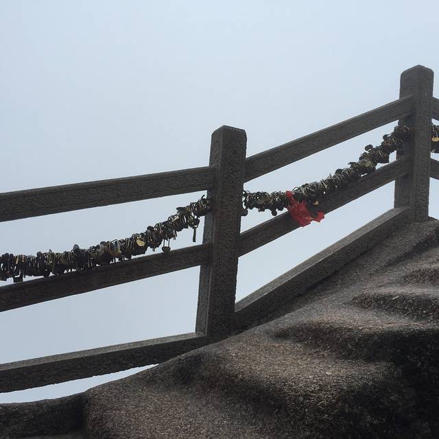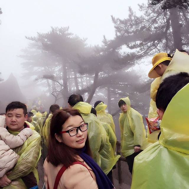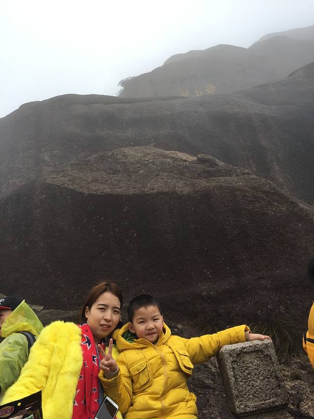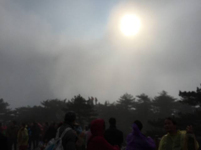 在离开迎客松时,风太大把太阳吹了出来,大家都欢呼雀跃,可是还没来得及拍照,太阳又被云层遮挡。从迎客松前往莲花峰的路上,人少了许多,一路两道,我们所走的道畅通无阻,可是,因大雾风雨天气,考虑到安全问题,莲花峰、始信峰、一线天都关闭了,额,怎么能这么对我们,我们可是千里迢迢来看你的啊!