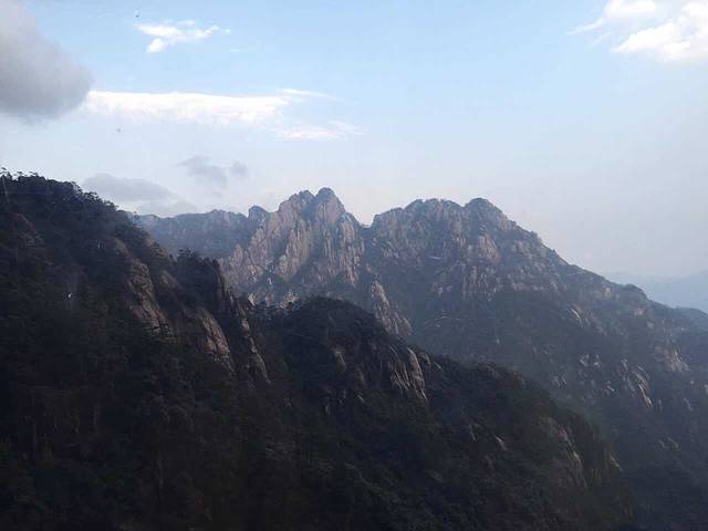 即使下着小雨也阻挡不了我们前进的脚步,备好雨衣,准备爬黄山了,只希望雨不要越下越大。晚上住在宏峰大酒店,离新国道入口只有五分钟的距离,但是早上九点多出发时,酒店已经空荡荡了,我们落后了不知道有多少。在下车抵达黄山脚下时,被远处黄山景色震惊了,这是我从未见过的山,壮观、独特、美丽!