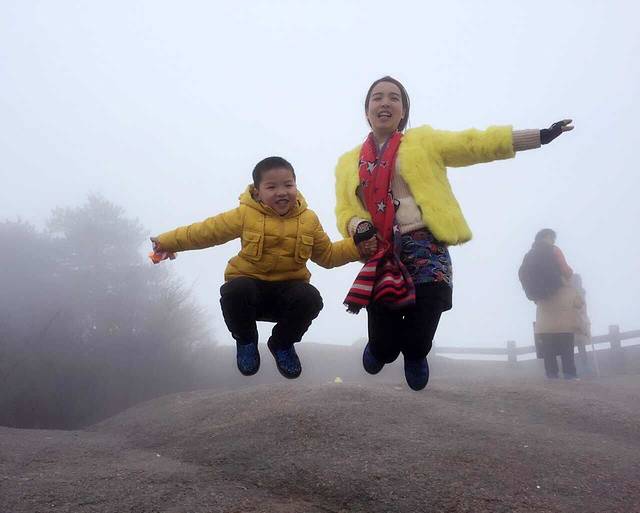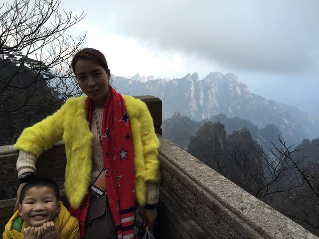 在白云宾馆稍作休息后,继续鼓励小牛牛前行,小家伙两岁多的时间就一个人爬完了长城,黄山对他来说,又是新的挑战,一路听话又懂事,玩雪、爬石、见水扔钱币许愿,也是欢乐不少。在光明顶时,太阳又再一次出现,好像希望重燃,再一次震彻山谷的欢呼声,唤醒了内心的渴望,一路安慰着自己,黄山一年大部分都是下雨天,可还是很想见艳阳天的黄山。入住白云宾馆,第二天在光明顶看日出是个不错的选择,要不是春节酒店爆满、房价涨太厉害,我也想在黄山看日出。