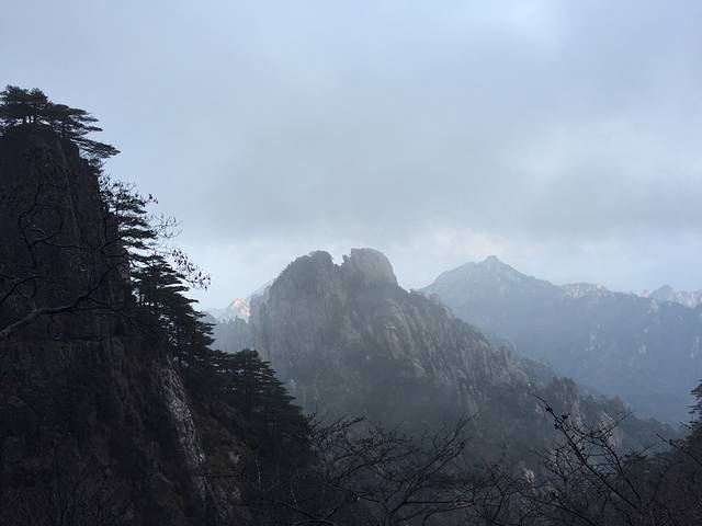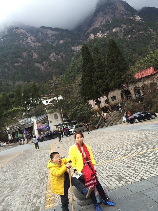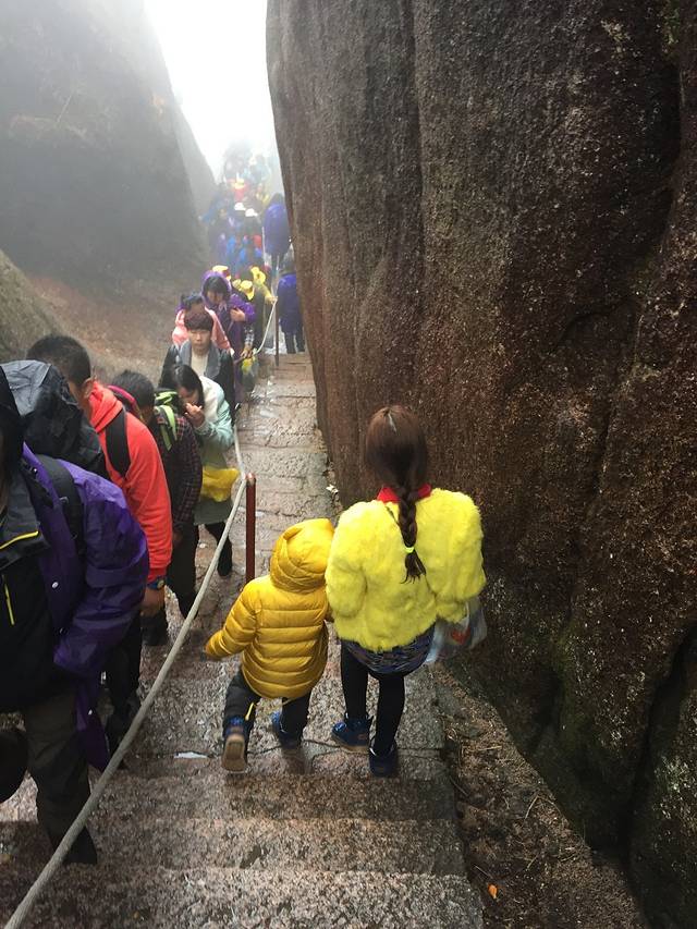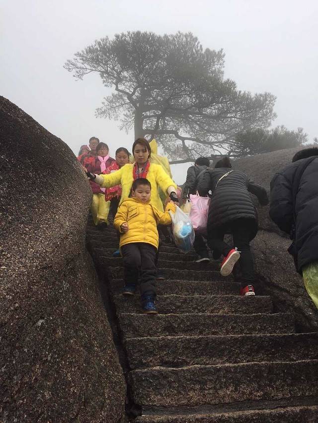 我们从慈光阁锁上山,考虑小牛牛不适宜爬完常走的经典线路,计划只爬慈光阁附近的景点,然后下山。但是天晴了,并不代表黄山就愿意露出面孔来,从慈光阁到迎客松,短短十五分钟的路程,硬是走了一个小时,大雾的黄山,犹抱琵琶半遮面,看的最清楚的是人群