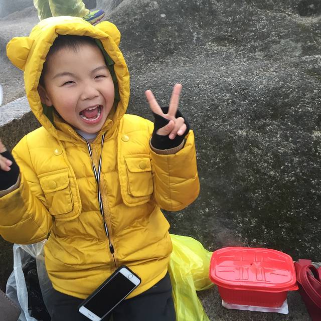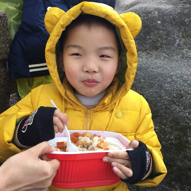 这就是我心心念念的迎客松,遗世而独立,看的不太清楚,还是有好多人花10元占据最佳地理位置照一张纪念照,相比景色,小牛牛对自热米饭更感兴趣,爬山累了,吃从山下带的自热米饭最充饥,小牛牛吃的时候很兴奋,可能没见过这种饭吧,吃完没走多久就肚子疼,不知道是不是米饭有问题,还是带零食保险,因为山上的厕所,真的很少!