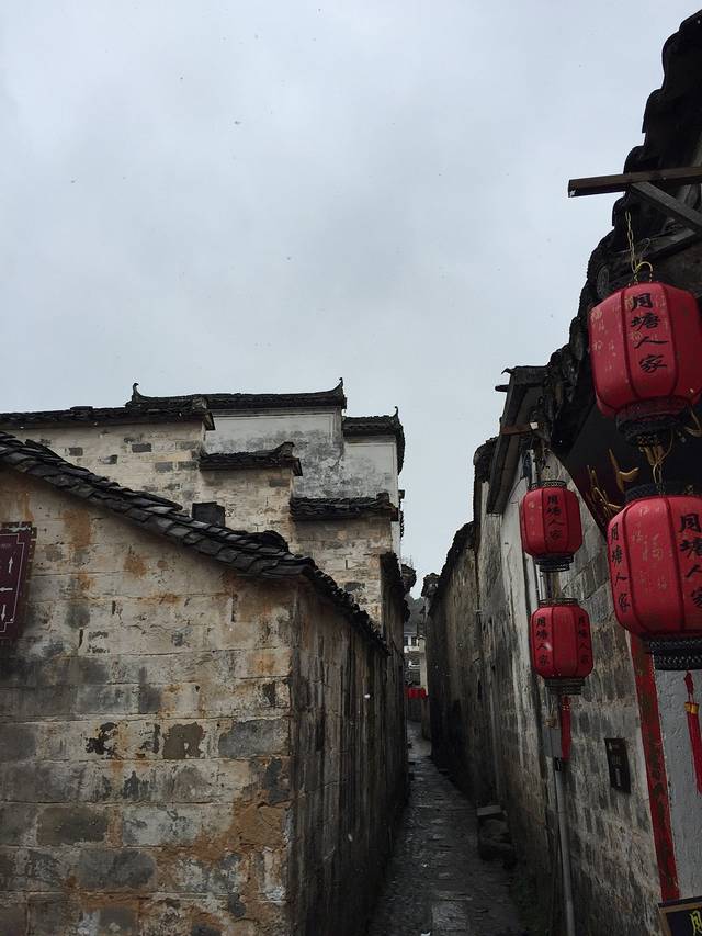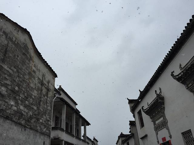 第二天,是2月14日,我一个人起早,以买早餐为借口独自出门,是想给不在身边的亲爱的选情人节礼物,清晨的宏村,很宁静,一片祥和,走着走着还下起了大雪,这是我今天看见的第一场雪,开心的已经不管冻僵的手了。能看见本地人慢悠悠的洗簌、做早餐,这些本地人居住在景区内,有的把房子改成了特色民宿,有的凭手艺买起了手工艺品,各尽其能,各显身手,但是也并没有打乱他们原有的生活。他们还是那么朴实,所以临走时,又购买了好多特色礼物,比如竹刻笔筒、陶瓷娃娃、竹刻吊坠等等。