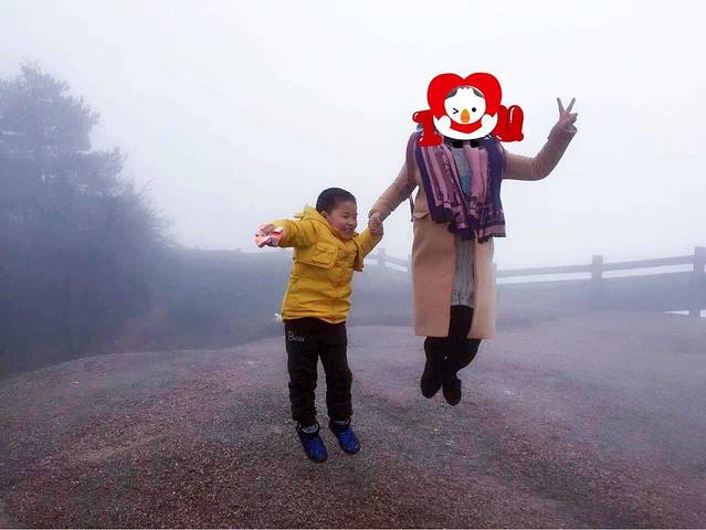 一山两世界,山上阴晴不定,山下晴空万里,额,只能说高处不甚寒,下山了,小牛牛很是兴奋,可能累着了,想着快要到酒店就开心吧!
