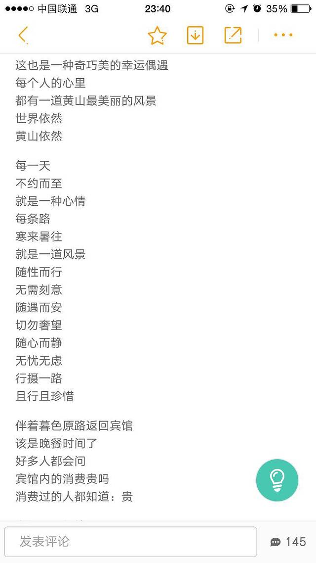 回到酒店已累惨,在酒店点餐直接打包上楼吃了,吃完把明天去宏村的客栈订了,就洗洗睡觉了。所住的宏峰大酒店,是在去哪儿上订购了一晚,去了老板说我们预定的价格低,早已经不是一百五这个价了,结果头脑发热的我们还没看房,就一同样的价格加订了一晚。这就是《影响力》中所说的缺货心理,老板运用的真到位,第二天在去哪儿看同样的房间只要我们的二分之一价格,跟前台理论也没用,谁让我们容易掉陷阱呢!酒店除了地理位置方便,还算安静、干净外,不具有任何优势、特点。