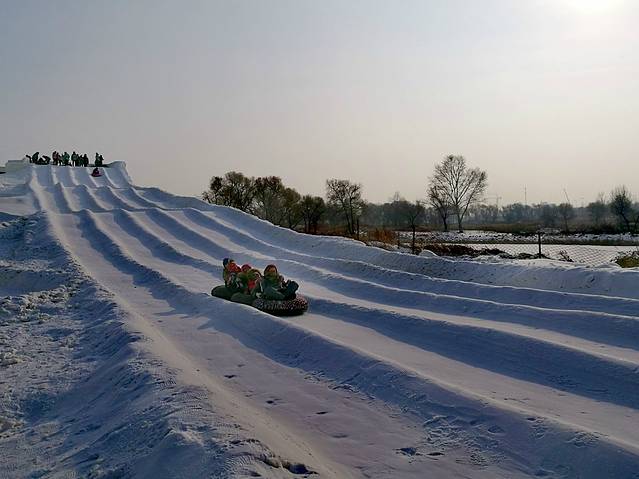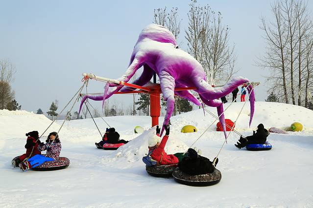 雪滑梯,全市规模最大的雪滑梯长达150米。