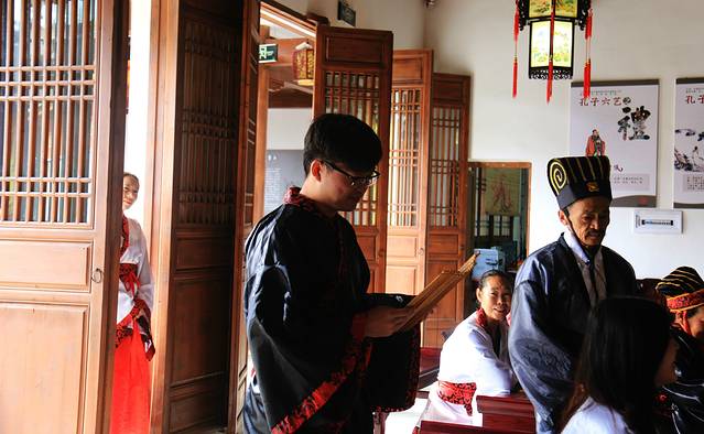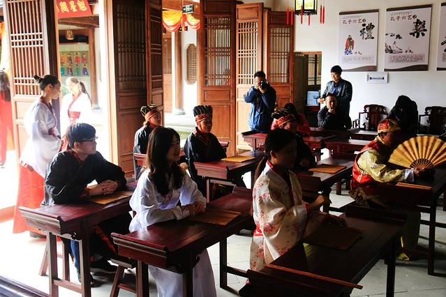 祭拜孔子结束,大家便进入励志堂跟随着演员扮演的孔子先生体验古代私塾。在演员们的熟练演技之下,我们似乎看到了古代私塾的原貌。