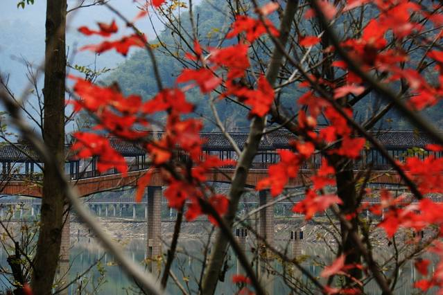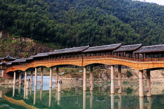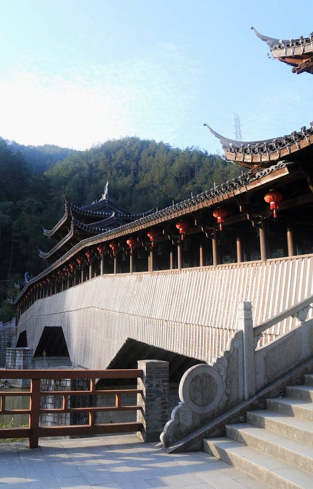 转个身,我们就可以看到畲族的特色廊桥啦。这一座廊桥,由政府出资六千万打造。全部的桥身利用木质卯榫结构打造,呈对称状态。在搭配上四周的青山绿水,不免让人想象到亭台楼阁的画面。
