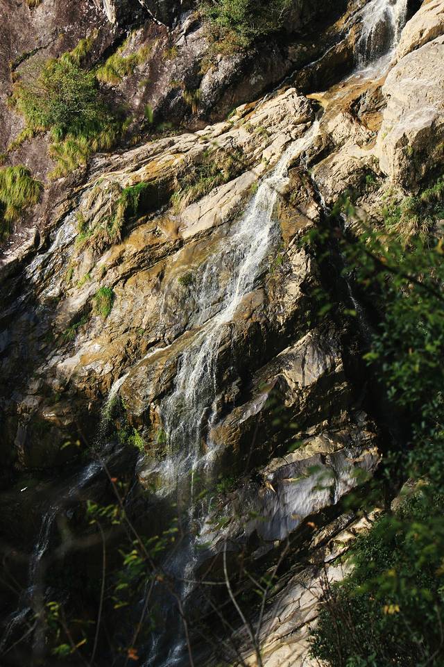 若是天气晴好,闭上眼睛,坐在秋千上面轻轻荡悠。感受着阳光穿过树林时的闪烁阳光,就好像上天给予的礼物一样。这一刻,内心忘却忧愁和烦恼,感受着世间的美好。接着向上走,可以看见位于山间的雪花漈。雪花漈是森林公园中有名的瀑布景观,可惜我去的时候是枯水季节,只有不多的水从山上倾泻下来,但是在阳光的照耀下仍然闪耀!