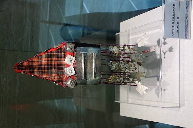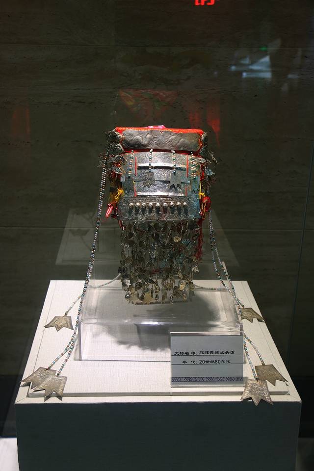 这是畲族特有的银质头饰,在灯光的照射下闪耀着,不禁让人想起跳着畲族舞蹈的畲族姑娘,头戴头饰、身着美丽的民族服饰在阳光下翩翩起舞。