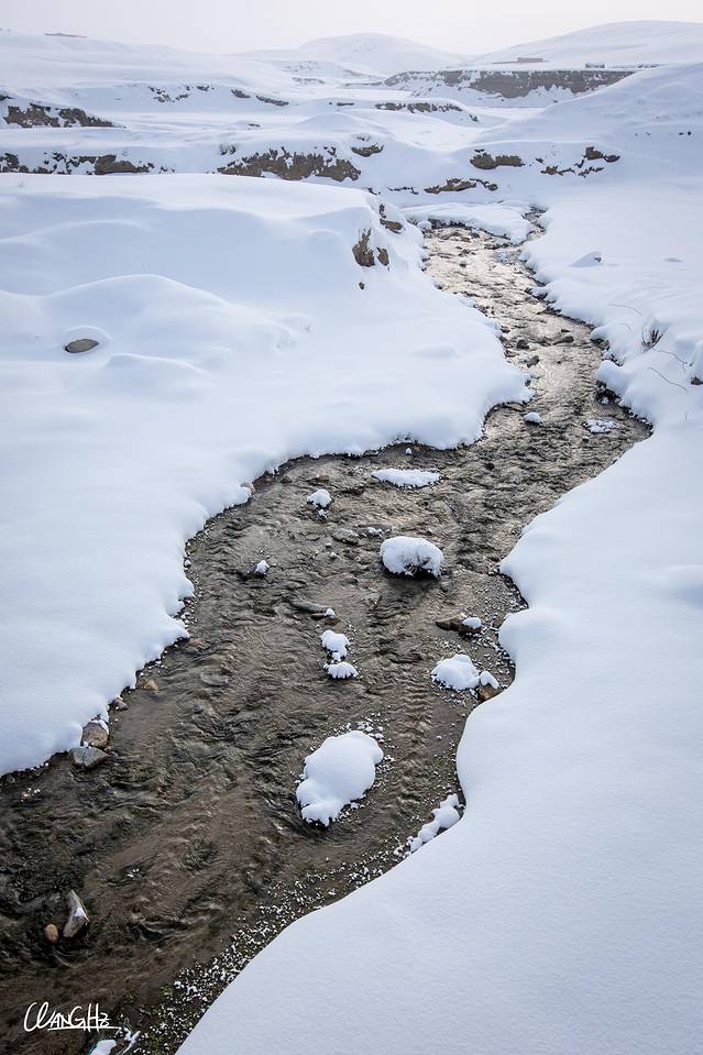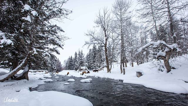 徒步上岸之后,我们又沿着喀纳斯的出水口一路回村子,这条路非常美,因为出水口水流较急所以不会结冰,和前几天不同,这一点都不《冰雪奇缘》,与背景中的冰天雪地搭配起来像极了小李子《荒野猎人》中的场景,置身这一方天地,我嘴唇嗡动却又说不出什么,直到现在我也描绘不出来当时的心情,那种悸动让我怀疑自己是身体不适,却又感觉到自己心跳无比蓬勃,我再一次神游万里,但是这次我能清楚听到自己脑子里的轰鸣,回过神来之后想叫,却又觉得是放肆。
