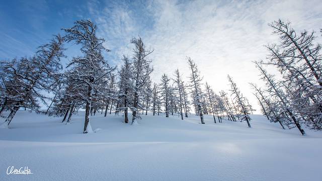 观看日出最好的地方,就是禾木村后山上的平台,从禾木河过了桥之后,有两条路,朝左是马拉雪橇的路,往右是徒步上平台的路,徒步的话大概40分钟就可以到达平台,如果徒步,一路的景色也要比马拉雪橇好,所以推荐大家去美丽峰的时候坐马拉雪橇,去平台的话徒步上山。