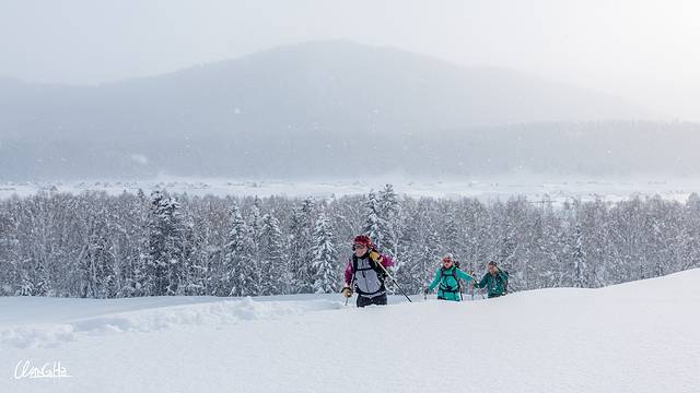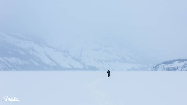 冬季的喀纳斯湖与其它季节蓝宝石般的湖面不同,整个喀纳斯湖全部被冰雪覆盖,可以下湖在冰面上行走,但为了保证安全和减少体力消耗,我们提前准备了秘密武器——踏雪板,通过将人体的重量分散在更大的区域,能够避免脚完全陷入雪中,有了它我们就可以快速安全的在雪中行走了。
