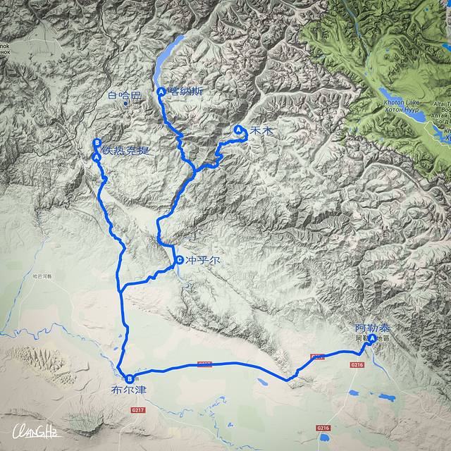 图中"阿勒泰 - 布尔津"路段会有少量积雪,但不会影响行车,一般情况下各类车均可顺利通过,而从"布尔津"开始后的路段,积雪开始明显增多,有些路段会到完全被雪覆盖的程度,这时,就是越野车的天下了,但注意,无论怎样,一定要2辆以上的车同时出行,以便互相救援。
