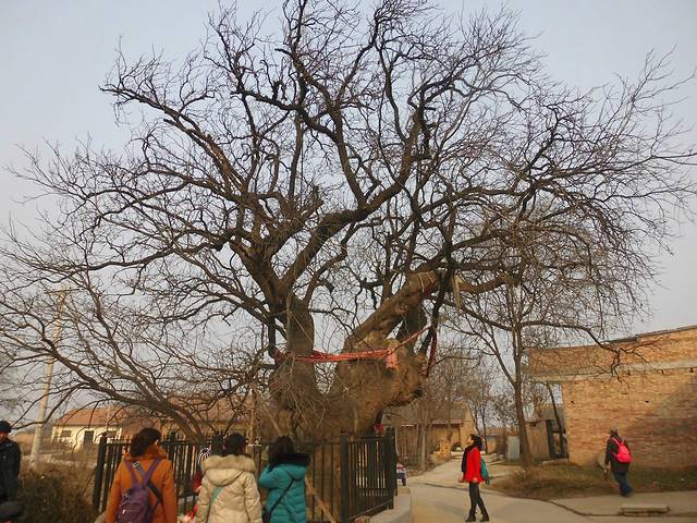 行至穆寨村村口,有当地人在买柿子,1元4个。所买的柿子分为火井和火丹两种,火井柿子大体上呈方形,而火丹柿子则要更圆一些。井对方丹对圆且熟透了的柿子一个一个红似火,真真的柿如其名。村子里有一棵千年的皂角树,可能因为是冬天的缘故树上只零星的挂着几颗皂角。沧海桑田,历经千年后仍孤傲的立在那里,在冬景中更显孤单。