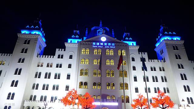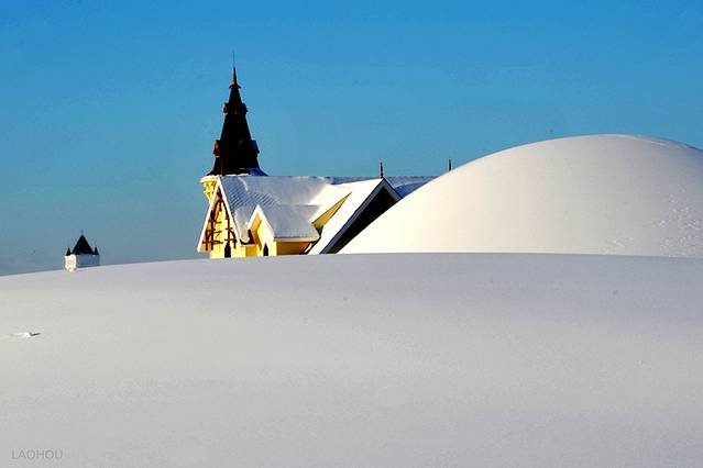 透过层层的雪丘看到城堡酒店的尖顶,仿佛穿越时空置身北欧一般。