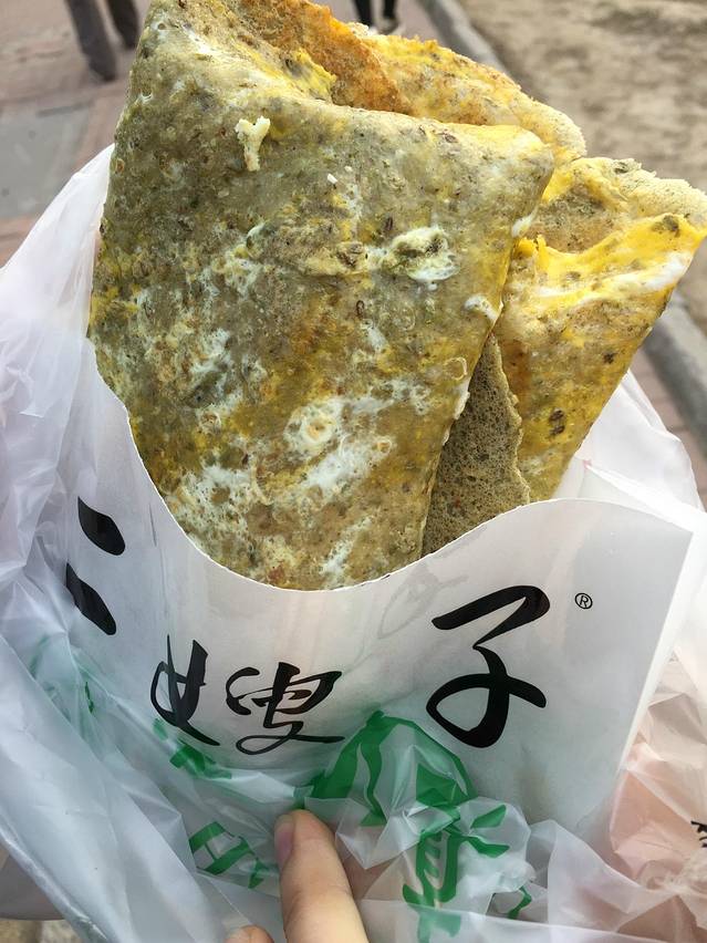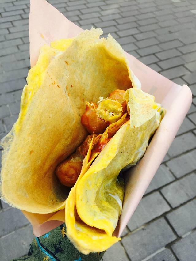 87年老大爷的煎饼果子:两蛋两果子才6块!才6块!周五出门时候珠江路地铁口一蛋一油条五块五(手动再见)而且真的是好吃啊!都是现摊的饼皮,最外面一圈非常脆,裹着蛋液的部分又柔软,早上吃一个顶饱一上午。
