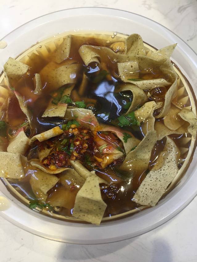 条状物就是绿豆煎饼!泡在勾芡过的汤底里,配上辣子香菜和腐乳,哈哈哈哈哈只想说口感很奇妙!这几样居然不冲!这真的是妥妥天津特色,外面从没见过!