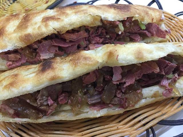 晚上没找到姐妹餐厅,吃了欧巴工作时间会吃的一家驴肉店。居民楼下的小店,都没法给大家推荐店名,但真的强烈推荐驴肉火烧!!!如图中的一个火烧,里面满满的肉和焖子,外皮脆香脆香,而!且!才!五!块!好好吃哦,再配个驴肉砂锅多满足啊~
